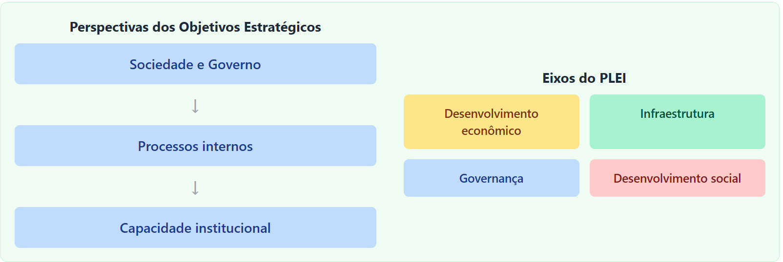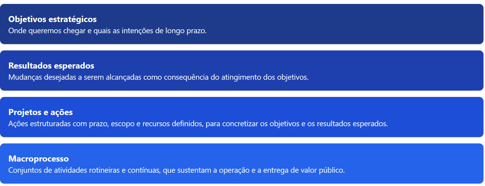 Em qualquer planejamento estratégico, os elementos objetivos estratégicos, resultados esperados, projetos e macroprocessos são componentes fundamentais e interligados, que juntos viabilizam a implementação eficaz da estratégia delineada pelo Plano.